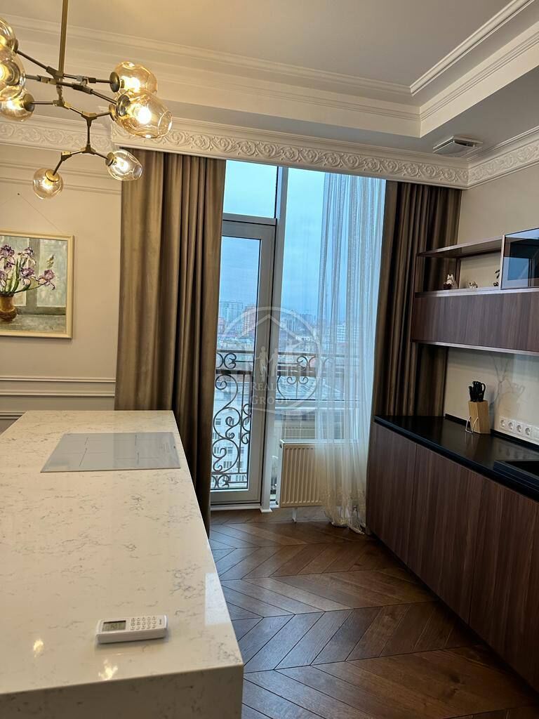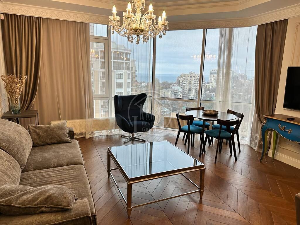 У квартирі зроблений якісний, дорогий ремонт, повна комплектація меблів та техніки, панорамне скління, вид на море.